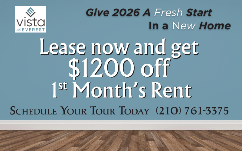 Welcome to Vista at Everest, a residential community featuring one and two bedroom apartments in San Antonio, TX. Spacious layouts and amenities welcome you home, along with exceptional service and an ideal location within walking distance to shopping, dining and entertainment options. Are you looking for an apartment for rent in San Antonio, TX? Contact our friendly, professional office staff to schedule a tour today.